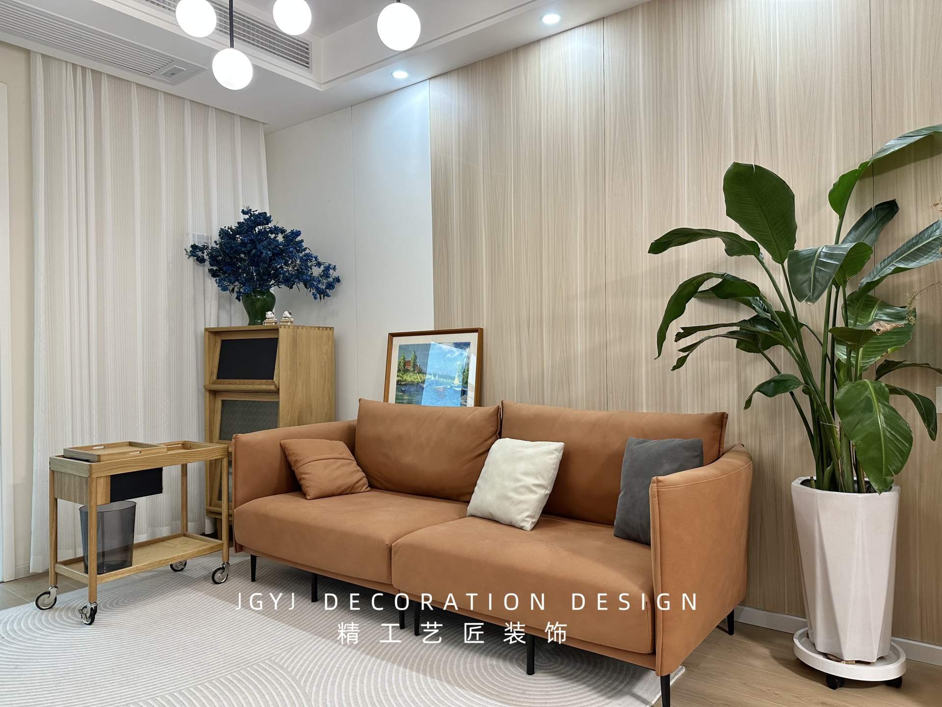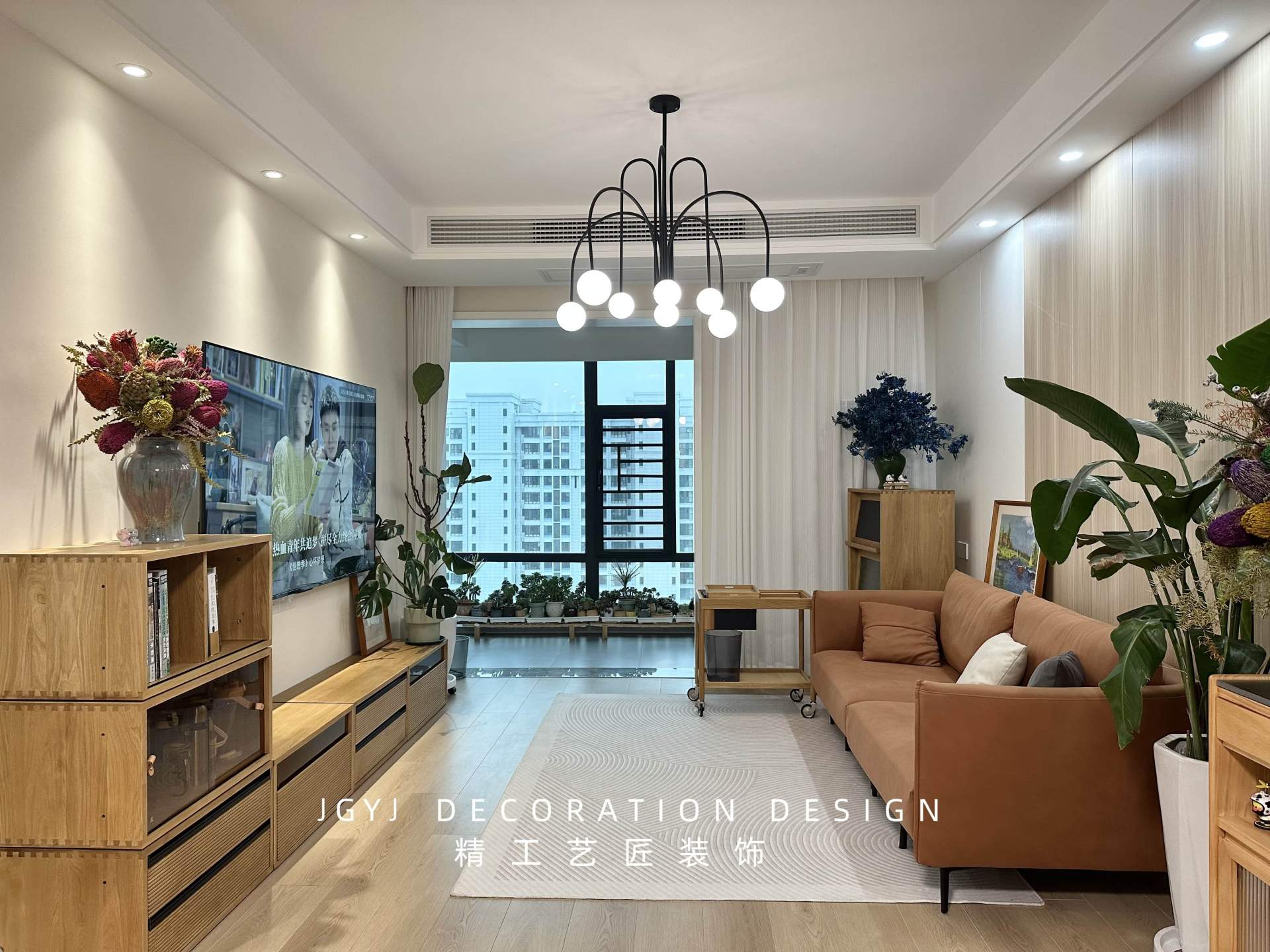 ·客廳以柔和的米白色墻面為基調(diào),搭配溫暖的原木色家具,與淺色背景形成鮮明對比,層次分明。