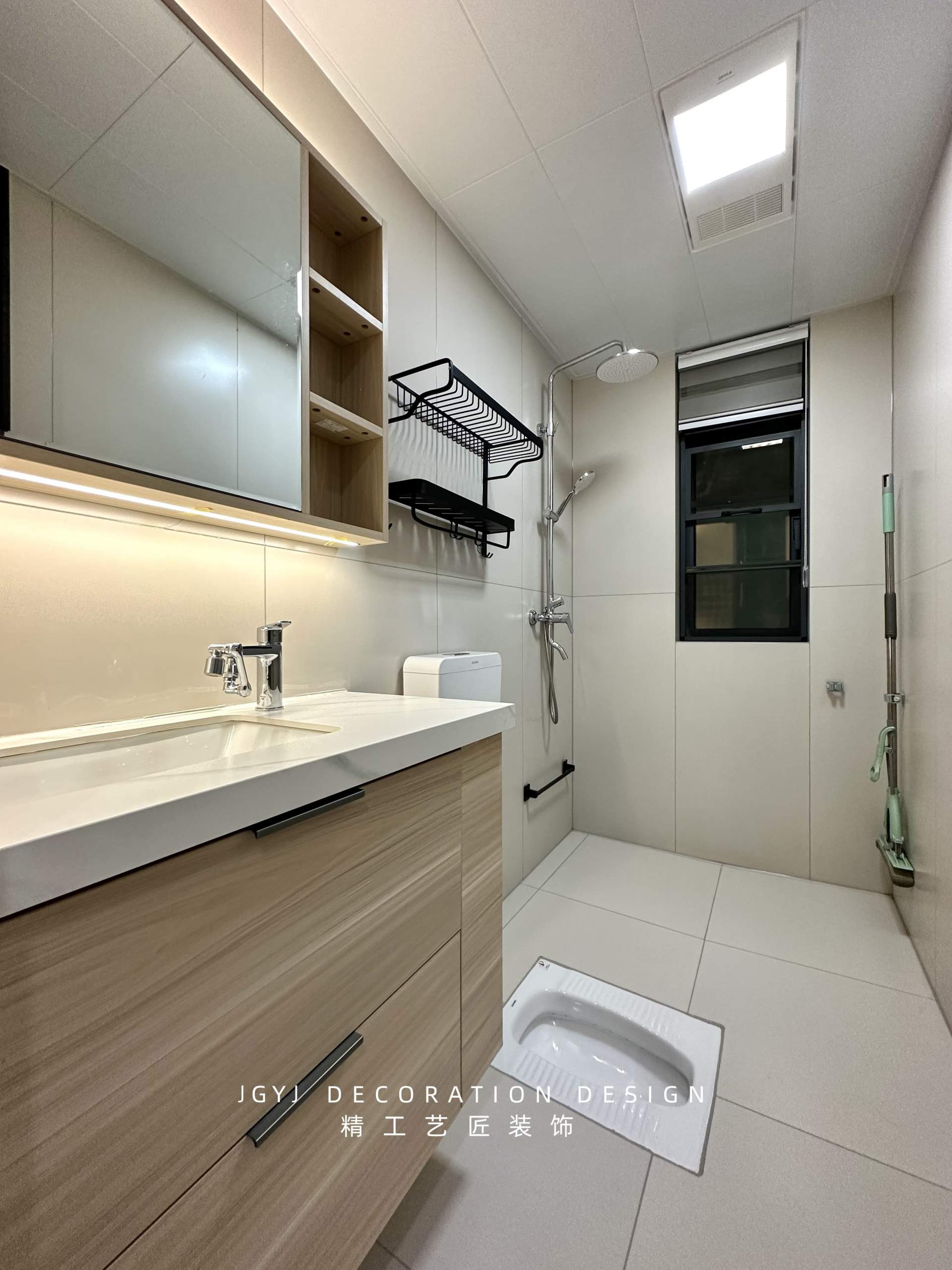 ·浴室的布局緊湊合理,洗手臺、蹲便器、淋浴區(qū)等功能區(qū)域劃分明確,互不干擾。